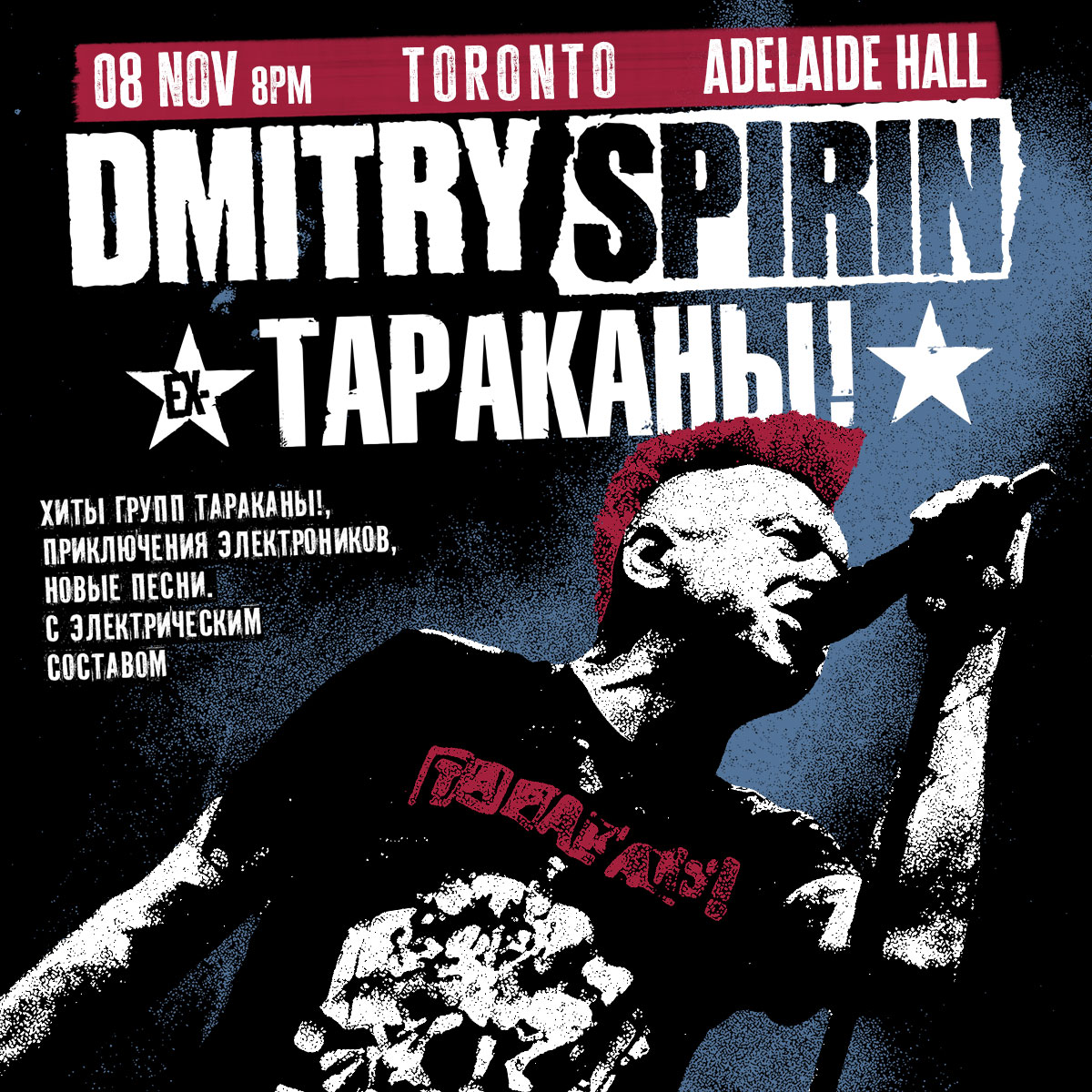 Dmitry Spirin (ex-Tarakany!) is coming to Canada for the first time ever — and he's not coming alone. Armed with a full electric band, the punk rock icon is ready to blast through your city with a no-bullshit live set packed with fire and fury.